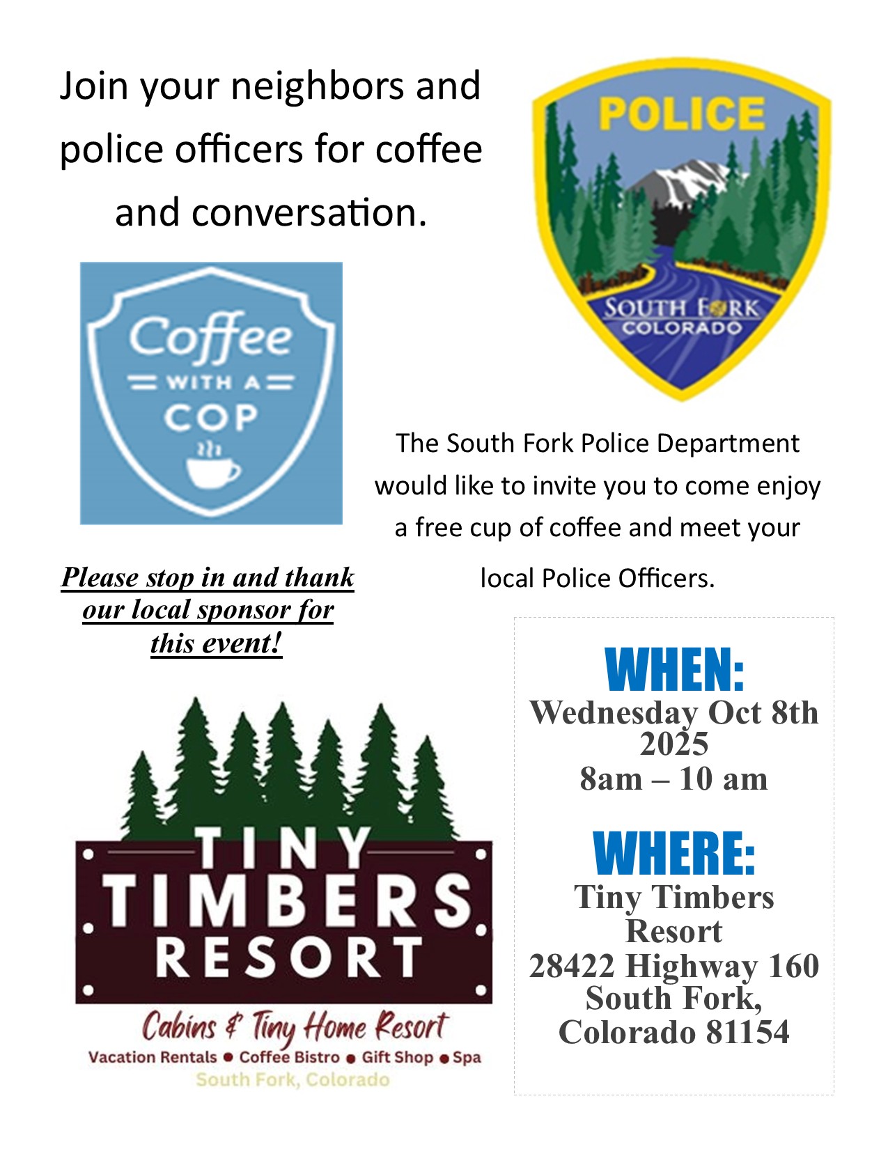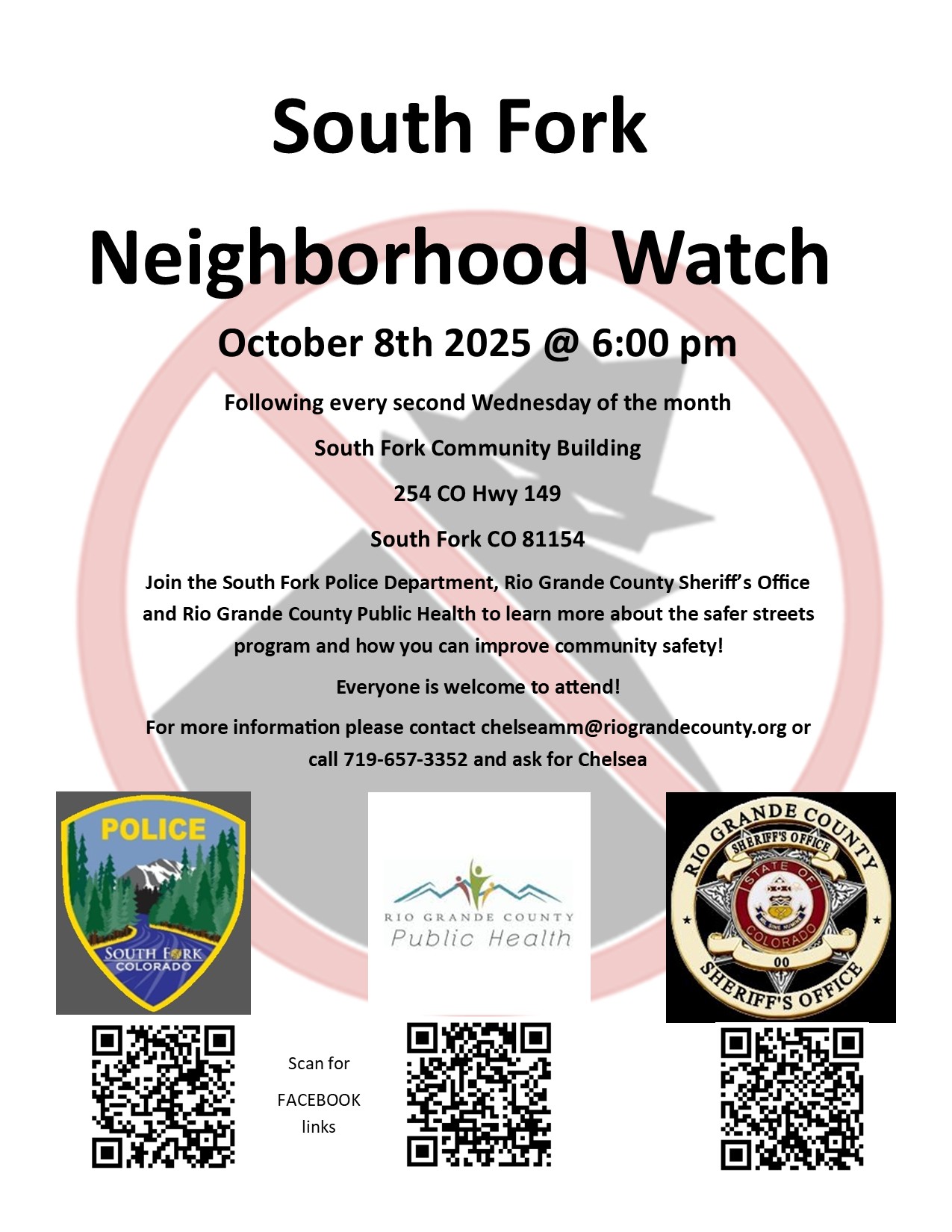 Please be aware that the Town’s leash law went into effect on July 14, 2025. As of this date all dogs must be on a 6-foot leash or less when out in public. For more information, please go to our website at https://townofsouthfork.colorado.gov/town-clerk and click on the Dog Regulations tab.