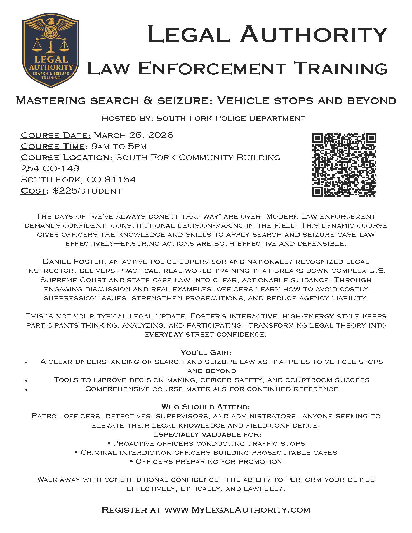 Lynn attended the South West Regional Law Enforcement Academy in Mancos CO graduating June 2nd 2024 and started working for the South Fork Police Department on June 13th 2024.